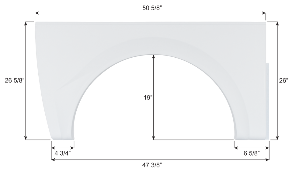 47 3/8" x 26 5/8"(F), 26"(R) - Single axle, Class A fender skirt. Constructed of durable, high-impact ABS plastic. This part is smooth & unpainted.