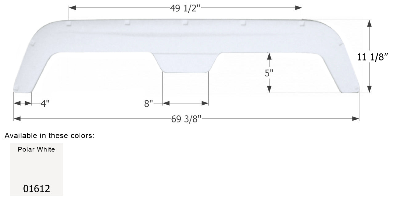 69 3/8" x 11 1/8" - Polar White tandem axle fender skirts. Constructed of durable, high-impact ABS plastic. This replacement fender skirt is textured.