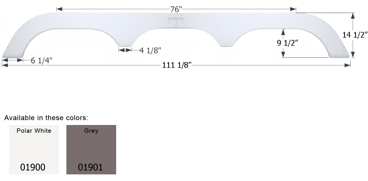 111 1/8" x 14 1/2" - Triple axle fender skirt, constructed of durable, high-impact ABS plastic. This replacement fender skirt is textured. The legs of these fender skirts curve underneath the trailer.
